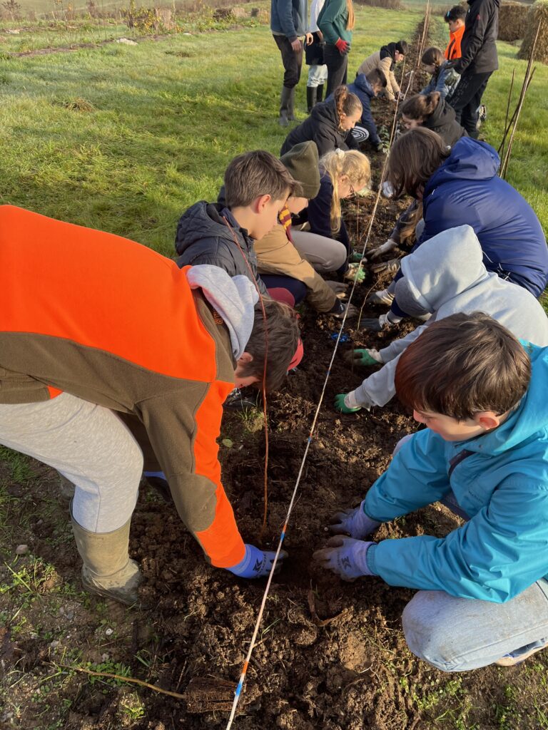 Nous, élèves de la 5ème B, avons participé à une plantation de haies, accompagnés par Mme Thivend et Mme Bichon. Pour cela, M. Condemine avait en amont repéré une zone propice à la plantation de haie et avait préparé la terre afin que la plantation soit plus facile. Puis, il nous a donné les uns après les autres un plant à disposer à un endroit bien précis le long d’une corde. Il ne restait plus qu’à planter : creuser un trou, placer le plant le plus droit possible, refermer avec la terre en tassant bien. Puis recommencer ces mêmes actions sur plus de 60 mètres ! (Groupe de Clara, Loucas, Maxence et Hugo)