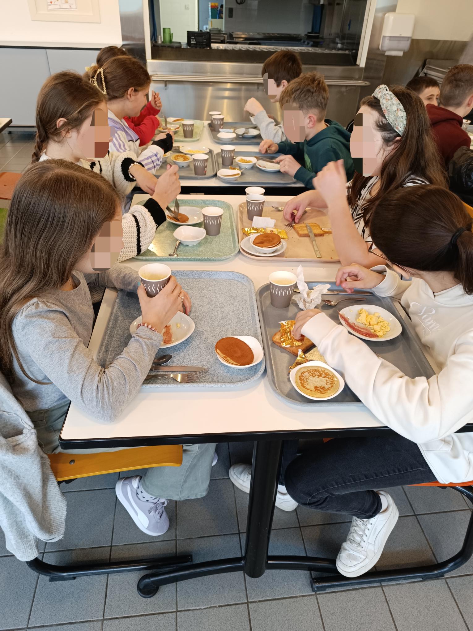 Ce lundi 23 février 2026, à 8h30, les 2 classes de 6ème ont eu droit à un “English breakfast” typique préparé par l’équipe de la cantine.
